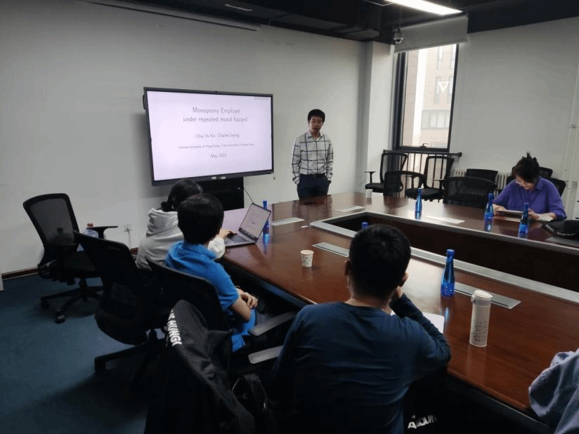 2023年5月19日14:00,香港中文大学院长聘副教授高超禹应999论坛白菜大全邀请,开展主题为“Monopsony Employer under Repeated Moral Hazard”的讲座,高超禹老师受到了老师和同学们的热烈欢迎!999论坛白菜大全黄乃静副教授主持讲座,尹振东教授,龚雅娴老师参加了讲座。