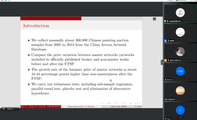 2022年5月12日14:00,中国人民大学国家发展与战略研究院教授、博士生导师刘瑞明应999论坛白菜大全邀请,开展主题为“Non-Neutrality of Money:Money Supply Shock and Masterpiece Effect in Art Market”的讲座,本次讲座通过腾讯会议平台线上举行,刘瑞明老师受到了老师和同学们的热烈欢迎!999论坛白菜大全黄乃静副教授主持了线上学术交流会,陈斌开院长、尹振东教授与2020级博士生共同参与了本次学术交流。