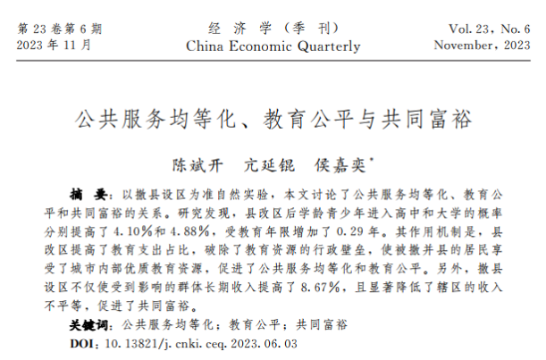 更多精彩内容请查看原文:陈斌开、亢延锟、侯嘉奕:《公共服务均等化、教育公平与共同富裕》,《经济学(季刊)》,2023年第23卷第6期。 DOI:10.13821/j.cnki.ceq.2023.06.03.