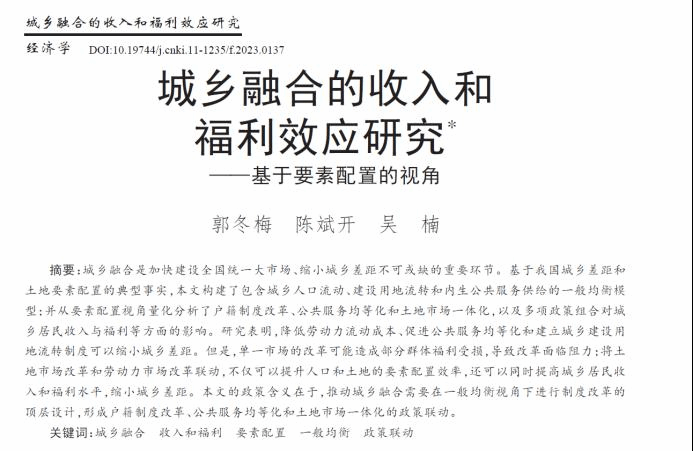 学术视点 | 白菜官网郭冬梅、陈斌开、吴楠老师的合作论文《城乡融合的收入和福利效应研究——基于要素配置的视角》在《管理世界》刊发