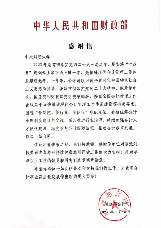 近日,白菜官网可持续准则研究中心主任刘轶芳教授收到了来自财政部会计司的感谢信。信中对刘轶芳主任在过去一年中参与的可持续披露准则评估工作给予了充分的肯定和表示感谢。