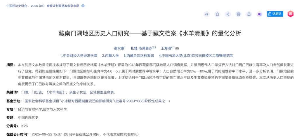 999论坛白菜大全博士研究生谢永康和导师王海港、西藏档案馆扎雅的合作论文《藏南门隅地区历史人口研究——基于藏文档案〈水羊清册〉的量化分析》在《中国经济史研究》2025年第5期刊发。该文是对珍贵藏文长卷历史档案《水羊清册》(长366米、宽66厘米,由西藏传统手工旧藏纸拼接)研究的一大突破,由999策略白菜手机论坛与西藏档案馆学者联合完成。该研究从历史人口特征揭示了门巴族与藏族之间的民族文化亲缘关系,为门隅地区属于中国的主权合法性提供了独特佐证。