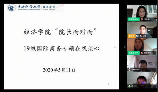 为深入了解国际商务专硕学生的想法和期待,进一步提升学院国际商务专硕的培养质量,院长陈斌开、副院长伏霖、副书记耿卉、组织员刘滨、国际经济系主任于爱芝、顾炜宇、祝伟、赵若思等8位专任教师和教辅老师于2020年5月11日下午,以在线会议的方式举行此次的“院长面对面”活动。陈斌开院长以及各位老师与999论坛白菜大全19级国际商务专硕班的全体学生,围绕专硕同学就学习和生活方面的切身问题,进行深入的交流沟通。