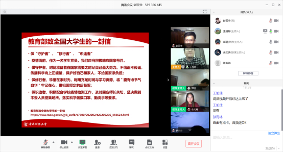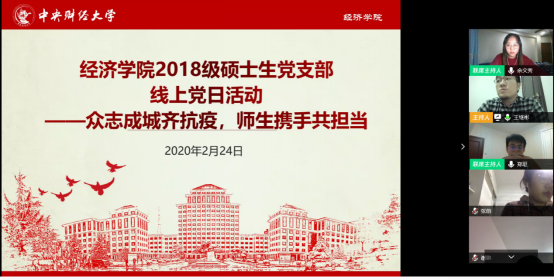 为深入学习贯彻习近平总书记关于疫情防控的重要讲话和指示精神,坚决打赢疫情防控的人民战争、总体战、阻击战,积极响应学院党委要求,999论坛白菜大全2018级硕士生第一、二、三党支部联合教工党支部,于2月24日开展线上主题党日活动。999论坛白菜大全院长陈斌开、组织员刘滨、政治经济学系何召鹏、党务秘书窦宗玥等老师与2018级60余名硕士生党员、入党积极分子共同参与活动。活动由2018级硕士生第三党支部书记王继彬主持。