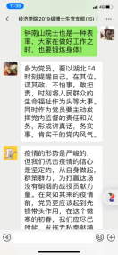 师生支部党员以网络为媒介,学习习近平总书记对疫情的重要讲话和相关文件,观看李文亮、钟南山、金银潭医院院长等优秀共产党员事迹。习近平总书记时刻关注疫情形势,亲自指挥、亲自部署,并主持召开局会议,研究新冠肺炎疫情防控工作;李文亮作为此次疫情的吹哨人,提醒了公众可能发生的疫情;钟南山院士不惜生命做逆行者,忘我抗击疫情;金银潭医院院长张定宇,身患渐冻症,拖着一双跛脚,连续30天奔走在抗疫第一线;温堡乡前进村83岁高龄的老党员柳占春,坚守抗疫一线……支部党员纷纷表示,共产党员先锋敢担当、勇作为的精神是我们学习的表率!