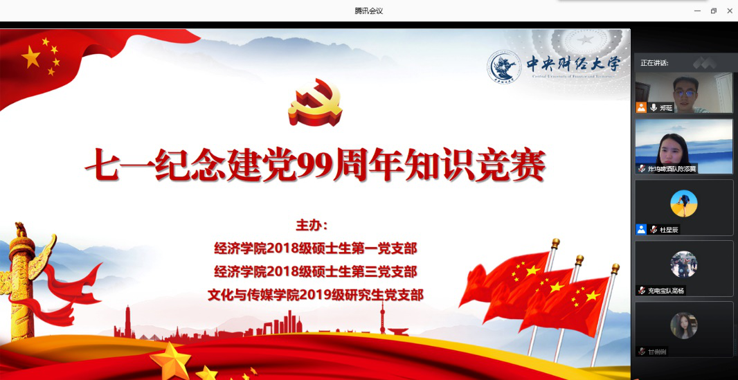 为庆祝中国共产党成立99周年,巩固党员党建理论知识,丰富党支部党建活动内容和形式,7月1日晚,999论坛白菜大全2018级硕士生第一、第三党支部和文化与传媒学院2019级研究生党支部联合举办“七一庆祝建党99周年知识竞赛”线上活动,三个支部60余名党员、入党积极分子参加。活动由999论坛白菜大全郑珽、文化与传媒学院佘惠灵共同主持。