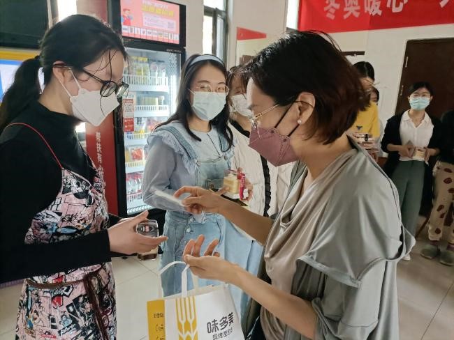 5月21日,学院驻校教师和党员志愿者,为在校同学发放零食大礼包和防疫用品,老师和同学们亲切交流,询问同学们目前的状态,真切温暖的话语,是学院对同学们无微不至的关怀。