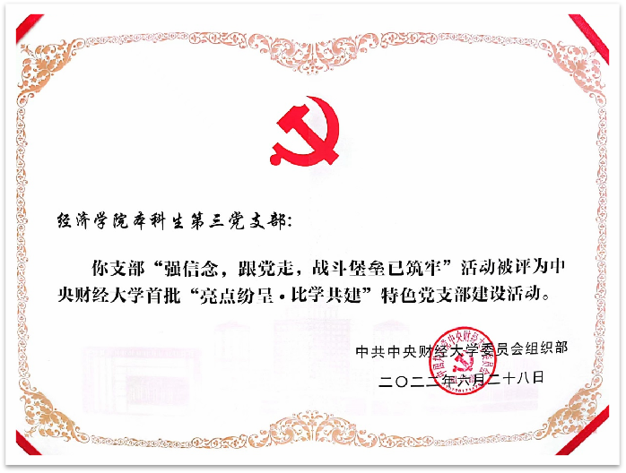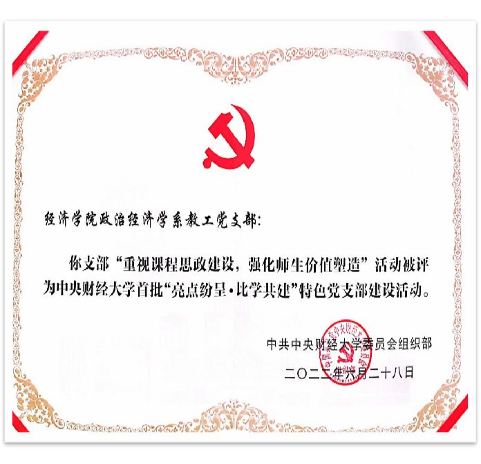 6月29日上午,在学校召开的庆祝中国共产党成立101周年大会上公布了第二批校级“党建工作标杆学院”、“党建工作样板支部”,首批校级“亮点纷呈·比学共建”特色党支部评选结果。此次评选“党建工作标杆学院”2个,研究生“党建工作样板支部”7个,教工“亮点纷呈·比学共建”特色党支部建设活动15个,本科生“亮点纷呈·比学共建”特色党支部建设活动6个。白菜官网入选校级“党建工作标杆学院”,经济史研究生党支部入选“党建工作样板支部”,政治经济学系教工党支部和本科生第三党支部分别获评999策略白菜手机论坛首批“亮点纷呈·比学共建”特色党支部建设活动。