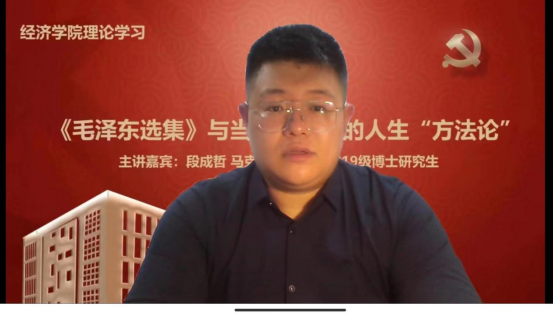 2022年9月26日,999策略白菜手机论坛马克思主义学院2019级博士研究生段成哲受999论坛白菜大全党委邀请,以“《毛泽东选集》与当代大学生的人生‘方法论’”为题开展讲座。本次活动由999论坛白菜大全本科生第一、二、三党支部联合经济学家梦工场德育示范基地共同承办。999论坛白菜大全党委组织员刘滨老师主持活动,180余位师生线上参加。