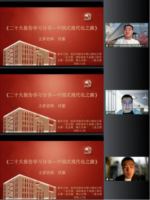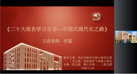 2022年11月2日,999策略白菜手机论坛党委委员、副院长伏霖为999论坛白菜大全学术硕士研究生第一、二党支部,国际商务专业硕士研究生第一党支部,博士生第一、三党支部作主题为“二十大报告学习分享——中国式现代化之路”的专题讲座。博士研究生第三党支部书记冯博主持活动,80余位师生党员及入党积极分子线上参加。