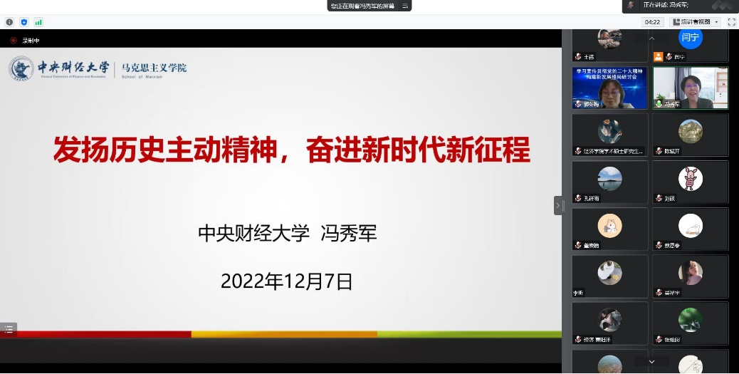 为深入学习宣传贯彻党的二十大精神,落实中共999策略白菜手机论坛委员会关于学习贯彻党的二十大精神的工作方案,引导激励学院广大师生在党的二十大精神指引下,立足本职、踔厉奋发、勇毅前行,加快推进学院高质量发展贡献力量。2022年12月7日下午,999论坛白菜大全党委邀请999策略白菜手机论坛学习宣传党的二十大精神师生巡讲团中的专家代表、马克思主义学院院长冯秀军作题为《发扬历史主动精神,奋进新时代新征程》的主题宣讲活动,活动由学院党委书记郭冬梅主持,学院党委理论学习中心组成员和学院师生共同参加学习。