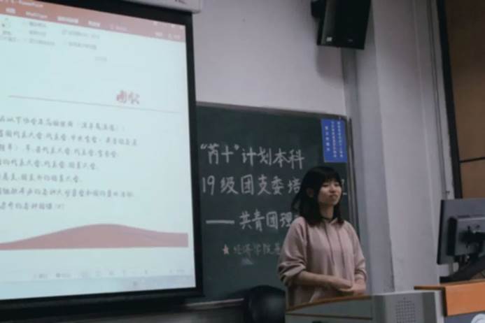 接下来,由于飞对团支委进行共青团理论培训。在讲课正式开始前,她用一段“入团第一课”的视频带领着团员们回顾了从1919年先进青年的五四运动到1922年中国共青团正式成立直至今日的辉煌所走过的光荣历程。同时,短片中对近年来中国共青团开展的线上线下系列活动进行了总结,让团员们对团史团情有了更深层次的了解。紧接着,于飞向团员们详细讲解了团徽团旗的组成及其象征意义,并带领各位团员认真学习各项团的章程。而后,她对白菜官网共青团重点工程——青年马克思主义者培养工程以及基础团校进行了详细介绍,并鼓励同学们积极参加。最后,于飞对“芮+”计划进行了整体系统的讲解,让各团支委对白菜官网“芮+”计划有了进一步的了解。