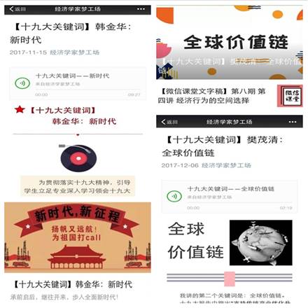 为贯彻落实十九大精神,引导学生立足专业深入学习领会十九大报告,经济学家梦工场特开设“十九大关键词”微语音专栏,邀请学院教师围绕十九大报告中的关键词,以微语音的形式为学生进行专业解读。本学期,邀请政治经济学系韩金华教授、宏观经济学系樊茂清副教授、数量经济学系孙昂副教授3位老师就“新时代”、“创新”、“全球价值链”、“信息化”等8个关键词进行解读。以点切入推动学生进一步了解十九大报告,深刻认识党的十九大召开的重大意义,全面掀起学习宣传贯彻党的十九大精神热潮,呼吁师生不忘初心、牢记使命,发挥学科特色,立足专业深入开展学习。