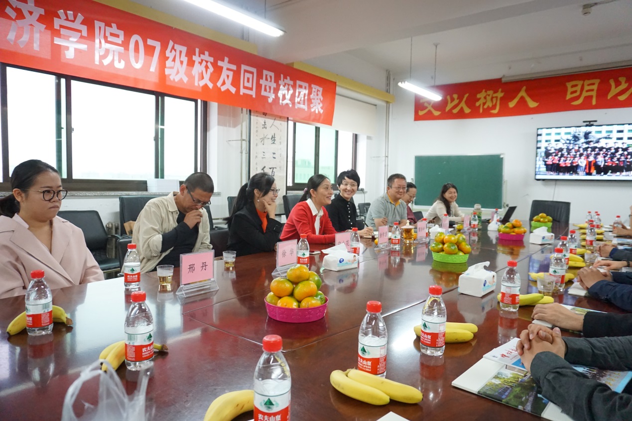 作为2007级的辅导员,学院教务干事胡燕老师也表达了对同学们返校的最诚挚的欢迎。她感慨五年时光匆匆而过,从相识到毕业,每位同学的点滴小事,这一路故事从脑海中闪过恍如昨日,时隔五年仍记忆犹新。她真情地祝愿学生们能工作顺利、事业有成、家庭幸福、圆圆满满。各位校友也对胡老师的照顾和关爱表达了感恩之情,表述了离校后对老师们和母校深深的思念。