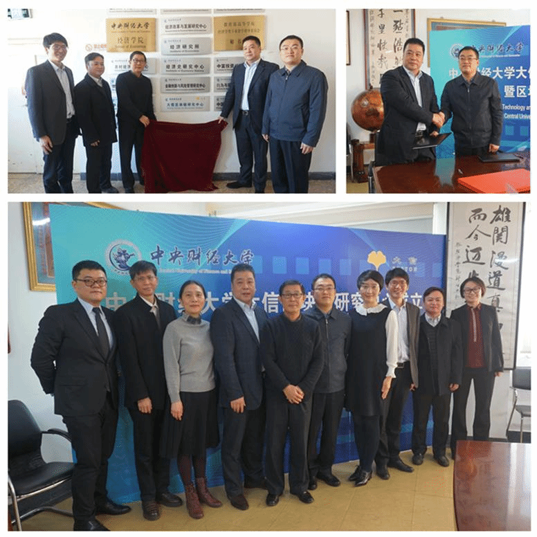 上午11时,黄强董事长代表大信金融集团、李涛院长代表999策略白菜手机论坛在战略合作框架协议上签字并交换文本。黄强董事长、李涛院长、陈斌开副院长、金哲松教授、顾炜宇副教授共同为“大信区块链研究中心”揭牌。999策略白菜手机论坛大信区块链研究中心正式成立。