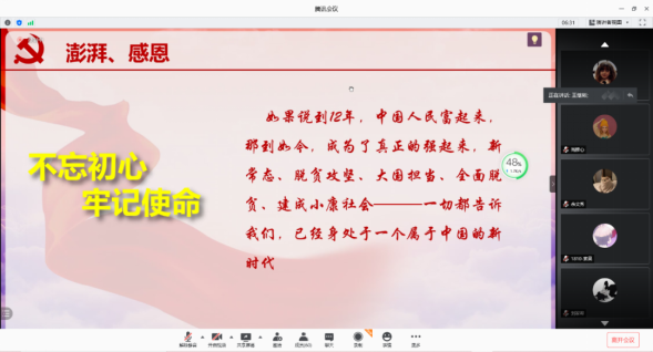 此次宣讲加深了支部成员对中国共产党经济工作史的认识,使大家深刻感悟到了中国共产党始终不渝为人民的初心和使命,也坚定了大家结合自身专业所学,为共产主义事业奋斗,为中华民族伟大复兴的中国梦砥砺奋进的信念和决心。同志们纷纷表示,要以此次宣讲为契机,学好党史、坚定信仰,以优异的成绩迎接中国共产党成立100周年。