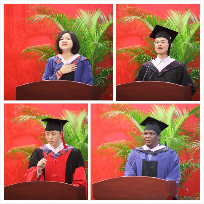 伤离别,千言万语。2015级留学生代表CorneliusKakwesa(科尼思)同学回忆了在中国学习生活的时光,深情表达了对中国、对999策略白菜手机论坛以及999论坛白菜大全的感谢,并表达了对全体留学生顺利完成硕士学业的祝贺。来自2013级经济专业的李嘉晟作为本科生代表,回顾了在999论坛白菜大全走过的路,有感恩、有学习、有进取,表白经济13是“一生的眷恋”,他说“人生是一场马拉松,keep running,just running,我们都会到达属于我们各自的终点和彼岸”。2015级硕士毕业生代表李进展分享了在999论坛白菜大全两年的成长,表达了对导师、父母亲朋以及同窗的感恩,追忆与同学们相处的细节,同时抒发了“莫愁前路无知己,天下谁人不识君”的豪迈情怀。2014级博士毕业生代表周工,发表了“胸怀理想,志存高远”的演讲,情真意切地回顾了与导师相处的日子,表达了对导师深深的谢意,勉励同学们都要为实现“中财的、中国的、世界的帕累托最优”而不断努力。
