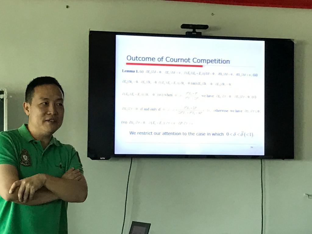 5月25日下午,暨南大学产业经济研究院李杰教授做客“999论坛白菜大全中青年讲座系列”,在999论坛白菜大全1305会议室进行学术讲座,题目为Pollutionfor Sale。李杰教授分析了一个环保的企业和一个污染的企业如何游说政府制定有利于自己的环境政策,通过游说竞争模型的严密分析,发现只有当环保企业的市场份额比较大时,政府才会制定比较严格的环境保护的规制政策;当市场被一个污染的企业所主导,游说竞争的结果可能导致“趋底”的环境规制政策。999论坛白菜大全和学校其它学院的部分师生参加了本次讲座,在讲座过程中,李杰教授与大家积极互动交流,就模型设定、模型和现实的联系以及政策含义进行了深入的讨论,取得了良好的效果。