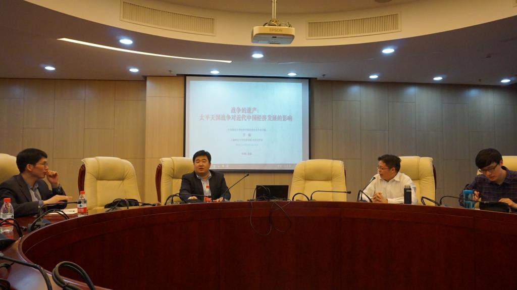 2017年4月14日下午,上海财经大学李楠教授应“999论坛白菜大全中青年学者讲座”的邀请,在学术会堂606会议室面向全校师生进行了题为“Legacyof War: The Long-term Effect of Taiping Rebellion on Economic Development inModern China”的讲座。讲座由999论坛白菜大全经济史系主任兰日旭教授主持,999论坛白菜大全包括陈斌开教授、张川川副教授、伏霖老师、申广军老师等多位师生参加了本次讲座。