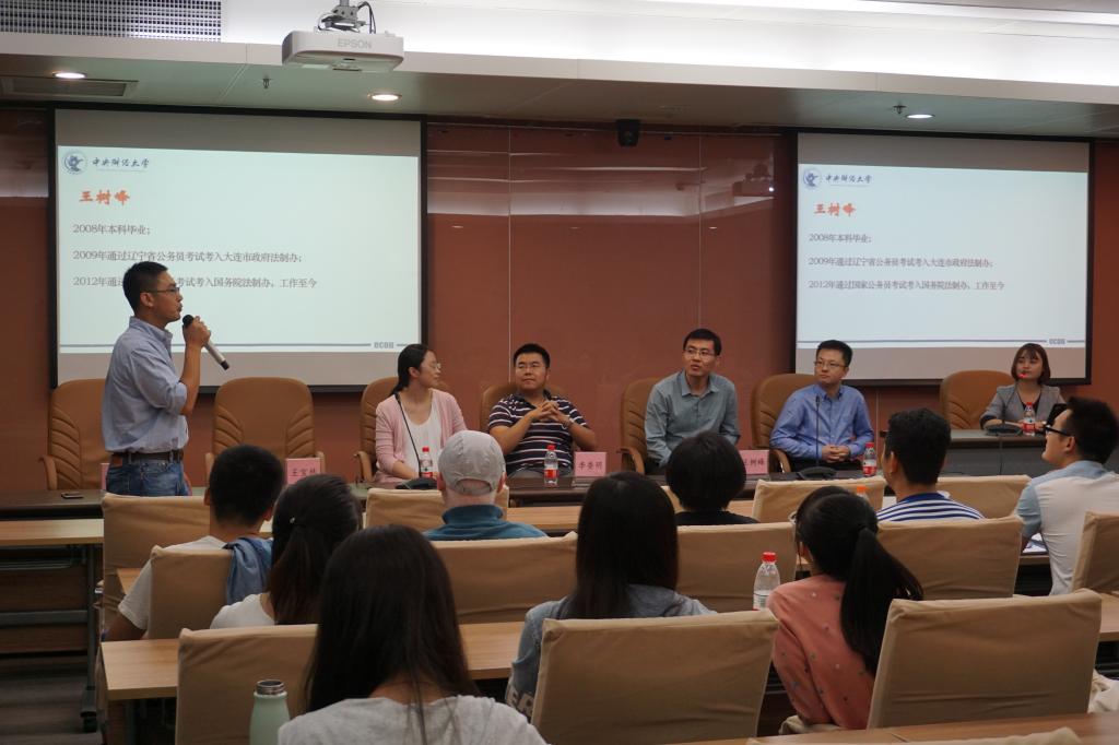 9月22日晚19:00999论坛白菜大全“勇往职前”就业系列活动以即将到来的公务员报考为契机,在学院伏霖老师的大力推动下,分别邀请了就职于发改委的王宝林、国务院的王树峰、审计署的麻富根、证监会的姚远以及现任教于首都经济贸易大学的华图教育创始人李委明五位嘉宾,与学院师生于学术会堂706进行了公务员专场交流。活动由学院就业干事谢文娟老师主持。