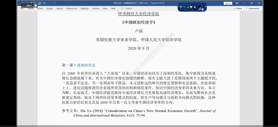2020年9月23日-2020年9月28日,伦敦大学亚非学院(SOAS)教授卢荻应999策略白菜手机论坛邀请,使用腾讯会议APP开展主题为“中国政治经济学”的讲座,本次讲座分为三部分:第一课“透视新常态;第二课“审视国企——‘退出、呼吁与忠诚’”;第三课“‘走出去’与世界范围的后进发展”。本次讲座由999论坛白菜大全副院长赵文哲老师主持,999论坛白菜大全部分师生及校外同学参加了此次讲座。
