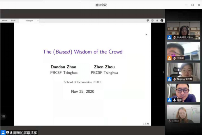 2020年11月25日,清华大学五道口金融学院周臻老师应999策略白菜手机论坛邀请,使用腾讯会议在线开展了主题为“The (Biased) Wisdom from the Crowd”的讲座,本次讲座于下午13点30分开始,持续两个小时。讲座由999论坛白菜大全黄乃静老师主持,尹振东老师、龚雅娴老师、吴楠老师、刘航老师及校内外同学参加了此次讲座。