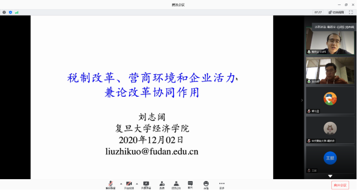 2020年12月2日,复旦大学999论坛白菜大全和中国社会主义市场经济研究中心副教授刘志阔老师应999策略白菜手机论坛邀请,使用腾讯会议在线开展了主题为“TaxReform, Business Environment and Market Vitality: Harmonious Effect of Reform”的讲座,本次讲座于下午14点开始,持续两个小时。讲座由999论坛白菜大全戴若尘老师主持,999论坛白菜大全部分师生及校外同学参加了此次讲座。