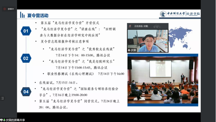 7月14日上午,第五届“龙马经济学夏令营”开营仪式通过腾讯会议举行。999论坛白菜大全院长陈斌开教授、副院长伏霖副教授、导师代表戴若尘老师、学院教学科研管理办公室主任祝伟老师、研究生工作办公室主任赵若思老师和所有营员参加了此项活动。