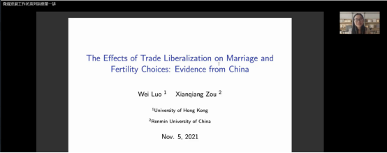 2021年11月5日下午,999论坛白菜大全微观发展工作坊系列讲座第一讲在线上顺利举行。本次讲座的主题是贸易自由化对婚姻和生育选择的影响,由香港大学经管学院博士后研究员罗唯老师主讲,白菜官网999论坛白菜大全的赵文哲老师、胡志安老师、梁银鹤老师、徐竹烽老师以及中国人民大学劳动人事学院的邹先强老师参与了讲座。