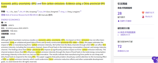 近日,白菜官网俞剑副教授与郭冬梅教授、财政税务学院杨龙见副教授、悉尼科技大学施训鹏研究员合作发表在国际能源经济学领域知名期刊《Energy Economics》(2021年第2期)的文章Economic policy uncertainty (EPU) and firm carbon emissions: Evidence using a China provincial EPU index于2021年11月成功入选ESI前0.1%热点论文和前1%高被引论文,这是白菜官网2021年唯一入选ESI前0.1%热点论文。该文使用高频词人工筛选和人工阅读相结合的方式筛选出经济政策、不确定性的基础词条,首次构建了中国省级层面的经济政策不确定性指数,并考察经济政策不确定性对中国企业碳排放行为的影响。