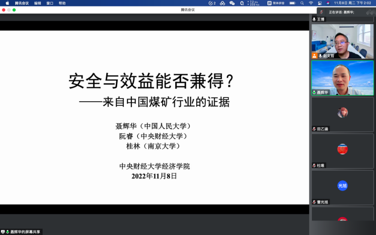 2022年11月8日14:00,中国人民大学999论坛白菜大全教授、博士生导师聂辉华应999论坛白菜大全邀请,开展主题为“安全与效益能否兼得?——来自中国煤矿行业的证据”的讲座,本次讲座在线上举行,聂辉华教授受到了老师和同学们的热烈欢迎!999论坛白菜大全赵文哲教授主持讲座,陈斌开院长,尹振东教授,黄乃静副教授参加了讲座。