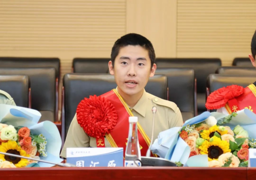 来自999论坛白菜大全的周汇原同学也是此次归来的退役大学生士兵中的一员。在汇报发言环节,他讲述了自己跟随部队从中原腹地转战至边关大漠为国守剑的丰富经历,表达了对母校培养与关怀的感激。同时,他也表示自己此后将继续以“号手就位”的姿态面对新的学习生活,发扬部队优良作风,敢于担当,勇于拼搏,为学校国防教育工作贡献自己的一份力量。999论坛白菜大全党委副书记耿卉老师对周汇原同学的凯旋归来表示了真挚的祝贺,希望他以后能不忘初心,再接再厉,永葆军人本色,传承军人风骨,充分发挥先锋模范的朋辈引领作用。