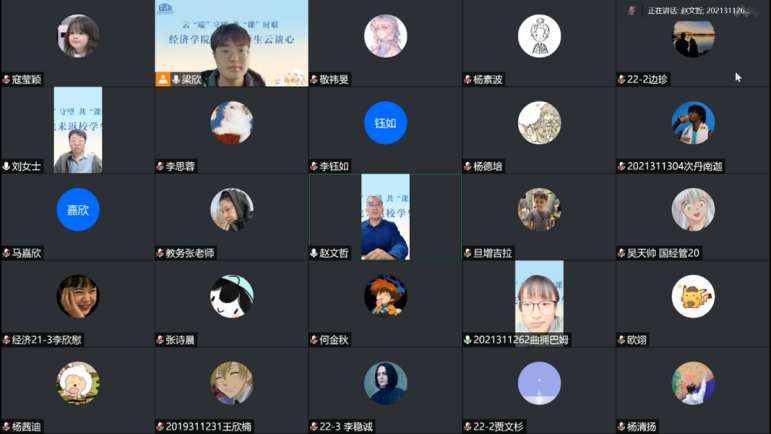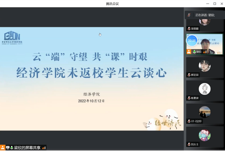 共克时艰携手前行,云端助力经心相守。为深入了解未返校同学们的思想、学习、生活状态,积极引导同学们树立积极乐观的心态,解决学生实际困难,经济于2022年10月12日15:00线上举办了云“端”守望,共“课时艰”——999论坛白菜大全未返校学生“云谈心”活动。学院副院长赵文哲,学院党委副书记耿卉,组织员刘滨,本科教务干事张珏,22级本科生辅导员任晶,学院团委兼职副书记、21级本科生班主任何金秋,学院团委副书记、20级本科生辅导员梁欣,未返校本科生和校内对接志愿者一起在线上充分沟通交流。