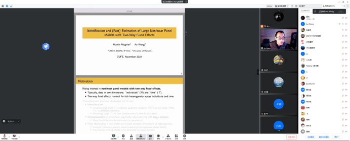 2022年11月24日16:30,华威大学经济学助理教授,华威大学全球经济竞争优势研究中心(CAGE)副研究员王骜(Ao Wang)应999论坛白菜大全邀请,进行了主题为“Identification and (Fast) Estimation of Large Nonlinear Panel Models with Two-Way Fixed Effects”的讲座。本次讲座在线上进行。王骜教授受到了999论坛白菜大全老师与同学们的热烈欢迎。999论坛白菜大全洪圣杰副教授主持讲座,黄乃静副教授参加了讲座。