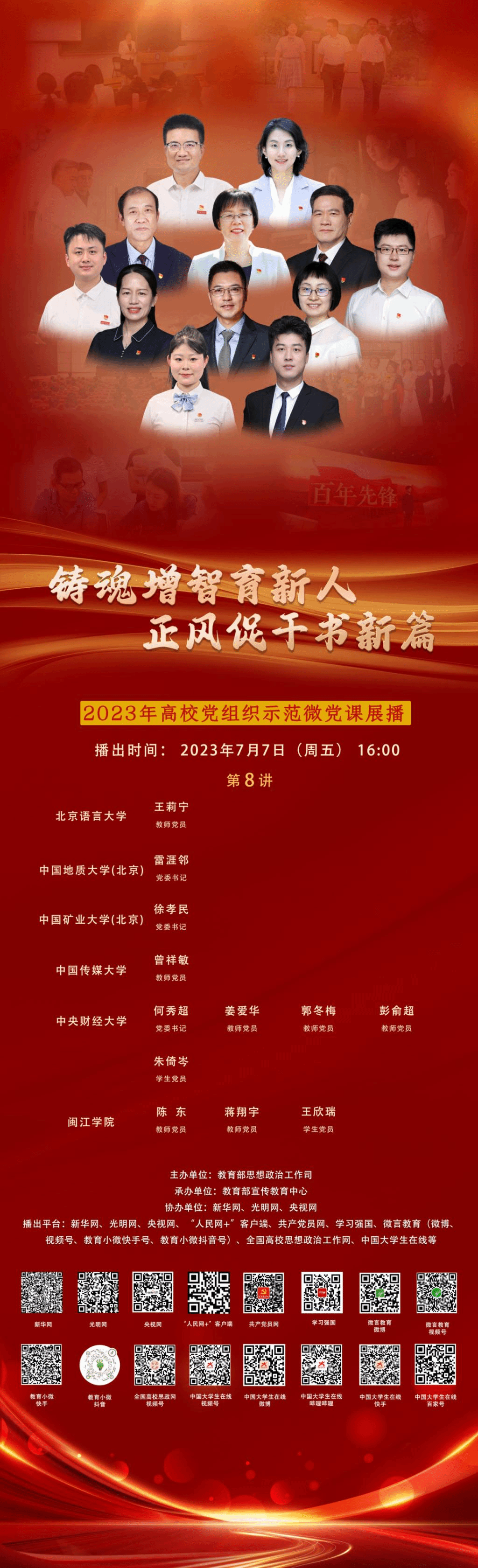 7月7日,由教育部思想政治工作司主办,教育部宣传教育中心承办的“铸魂增智育新人,正风促干书新篇”微党课第8讲正式上线。白菜官网党委书记何秀超,北京市优秀共产党员、财政税务学院教授姜爱华,999论坛白菜大全党委书记郭冬梅,金融学院副院长、金融科技系教工党支部书记彭俞超,北京高校优秀共产党员、马克思主义学院博士研究生朱倚岑,为全国高校师生带来题为《在中国式现代化新征程中贡献中财大力量》的示范微党课。