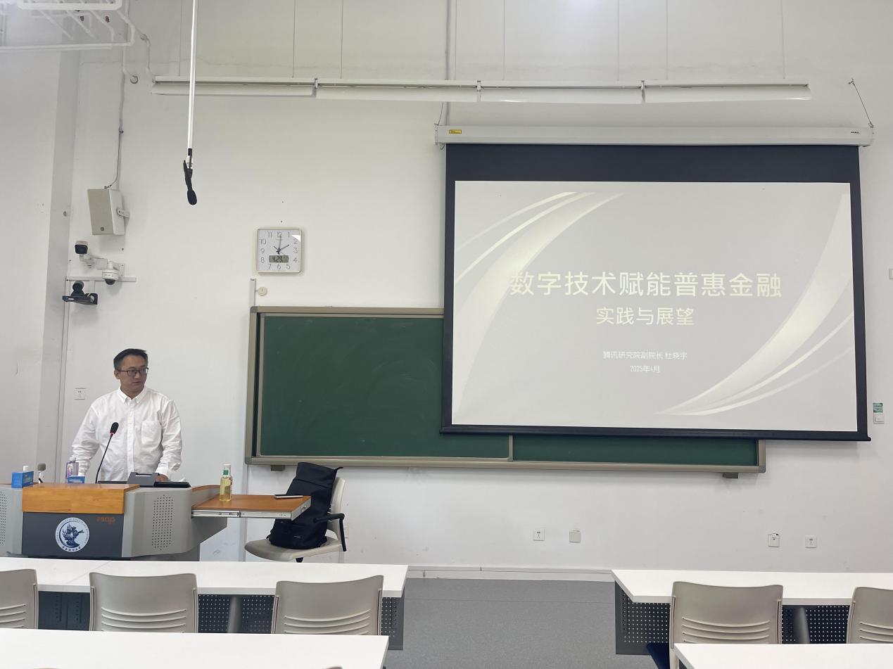 在数字技术飞速发展的当下,普惠金融迎来了新的发展契机。2025年4月29日下午,腾讯研究院副院长杜晓宇带来了一场以“数字技术赋能普惠金融:实践与展望”为主题的精彩讲座,为2024级国际商务专硕班的同学们深入剖析普惠金融在数字时代的发展变革、科技赋能的实践成果以及未来的发展方向。