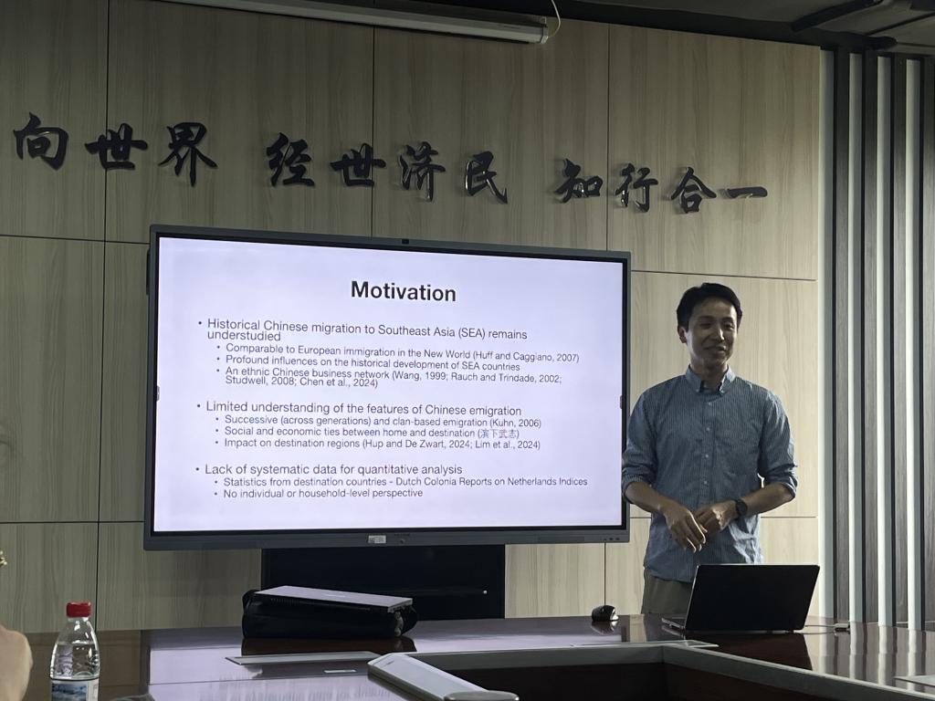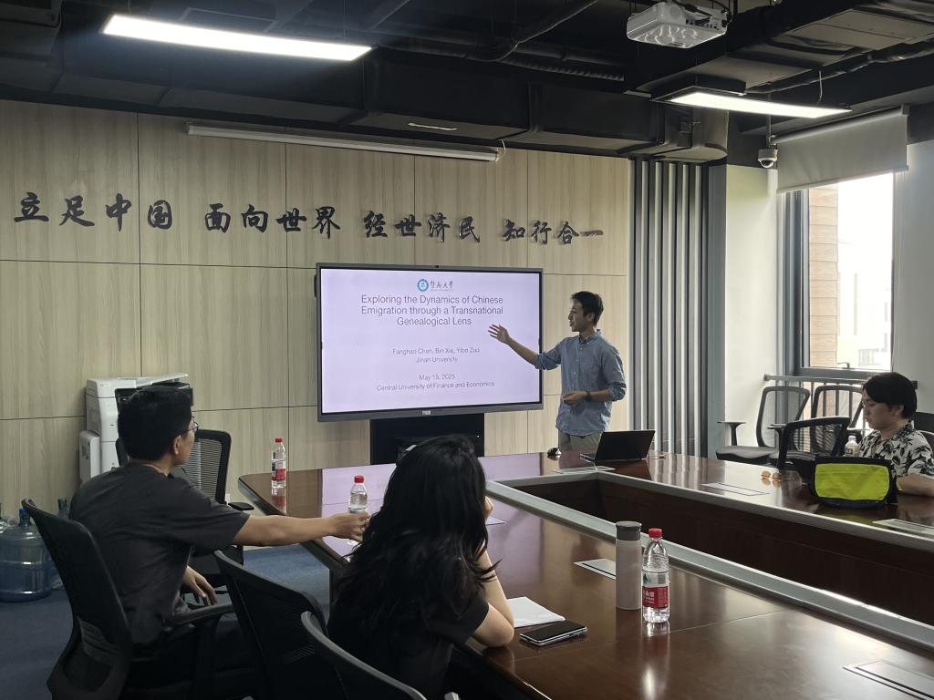 5月16日周五下午,999论坛白菜大全“中青年学者讲座”于沙河校区学院楼11号楼308会议室举行。此次讲座邀请到暨南大学999论坛白菜大全陈方豪助理教授,分享题为“Exploring the Dynamics of Chinese Emigration through Transnational Genealogical Lens”的研究。999策略白菜手机论坛胡志安副教授主持讲座,999论坛白菜大全多位老师和十余名学生参加了此次讲座。