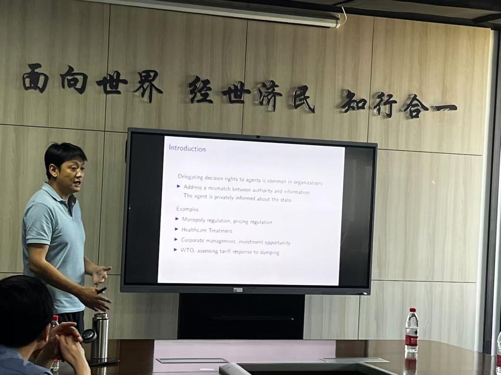 5月27日周二下午,999论坛白菜大全“中青年学者讲座”在沙河校区学院楼11号楼308会议室举行。此次讲座邀请到北京大学国家发展研究院胡岠长聘副教授,分享题为“Robust Delegation”的研究。999策略白菜手机论坛尹振东教授主持讲座,多位老师和学生参加了此次讲座。