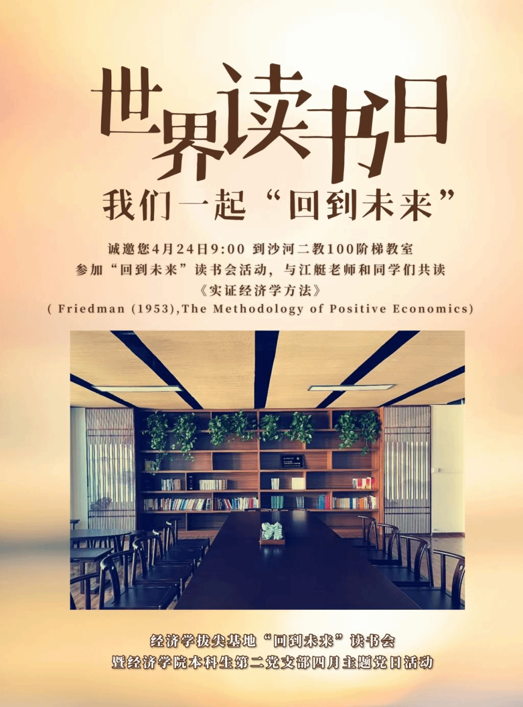 人间四月芳菲尽,正是读书好时节。为了贯彻落实习近平总书记致首届全民阅读大会举办的贺信精神,响应党中央关于“倡导全民阅读、建设书香社会”的战略部署,推进学习型党组织建设,营造多读书、爱读书、读好书的浓厚氛围,经济学拔尖基地和999论坛白菜大全本科生第二党支部联合举办世界读书日宣传活动,推广4月24日“回到未来”读书会活动,届时基地将邀请中国人民大学江艇副教授与中财大学子共读《实证经济学方法》Friedman (1953)。