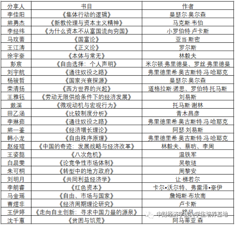 本次系列读书会上,先后有26位同学做了精彩纷呈的分享,受益匪浅。其中,熊勇杰同学分享了马克思·韦伯写作的《新教伦理与资本主义精神》一书,本书主要探究的是宗教性因素是通过什么机制产生出了资本主义精神。作者以严谨的逻辑、丰富的史料、敏锐的观察排除了大量的竞争性假说,排除了资本主义精神内生于资本主义制度的可能,并揭示了资本主义精神的本质特征。读者可以看到思想在历史中是如何一步步影响人们的行动,并感受到马克思·韦伯对其祖国、对人类命运的强烈关怀。赵娅瑄同学分享了由林毅夫、蔡昉、李周所著的《中国的奇迹·发展战略与经济改革》。作者从发展战略的角度系统阐述了中国传统经济体制形成的逻辑起点,继而通过与同时期经济腾飞的日本和“亚洲四小龙”的发展战略进行比较,得出本书的主要观点:一个经济的发展绩效主要取决于其发展战略的选择。本书通过对中国改革的道路与经验的深入理解,立足于中国国情,从发展战略选择与资源禀赋之间的矛盾出发,系统地分析了中国传统经济体制模式形成的逻辑,建立起了基于中国改革与发展实践的转型经济学的基本理论与分析逻辑。