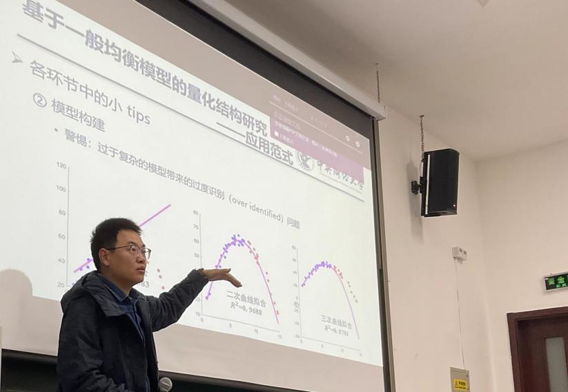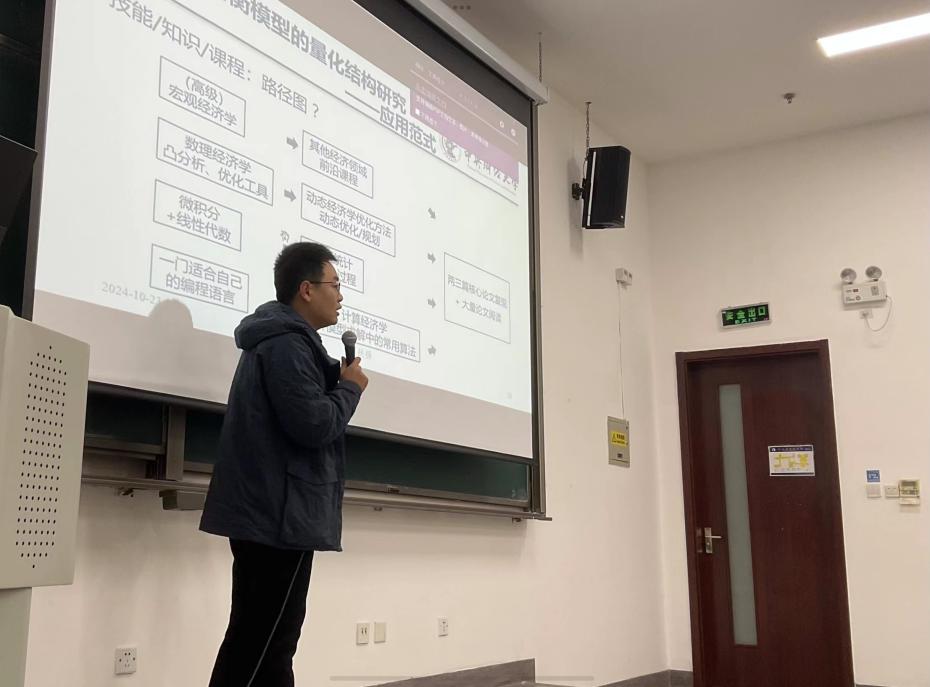 10月23日,999策略白菜手机论坛数字经济时代经济学拔尖学生培养基地班“科研基础训练”课程第四讲在沙河校区主教106教室正式举行,999策略白菜手机论坛赵扶扬副教授为同学们带来以“理论模型研究范式简介”为主题的讲座。赵扶扬副教授从如何看待经济学研究方法展开,为我们介绍了当今经济学界各种主流的基于理论模型的研究范式,最后落脚于基于一般均衡模型的量化结构研究的具体办法,让同学们建立起对经济学研究方法的系统性认识,以及了解如何精进自身,更好地掌握应用各类研究方法。