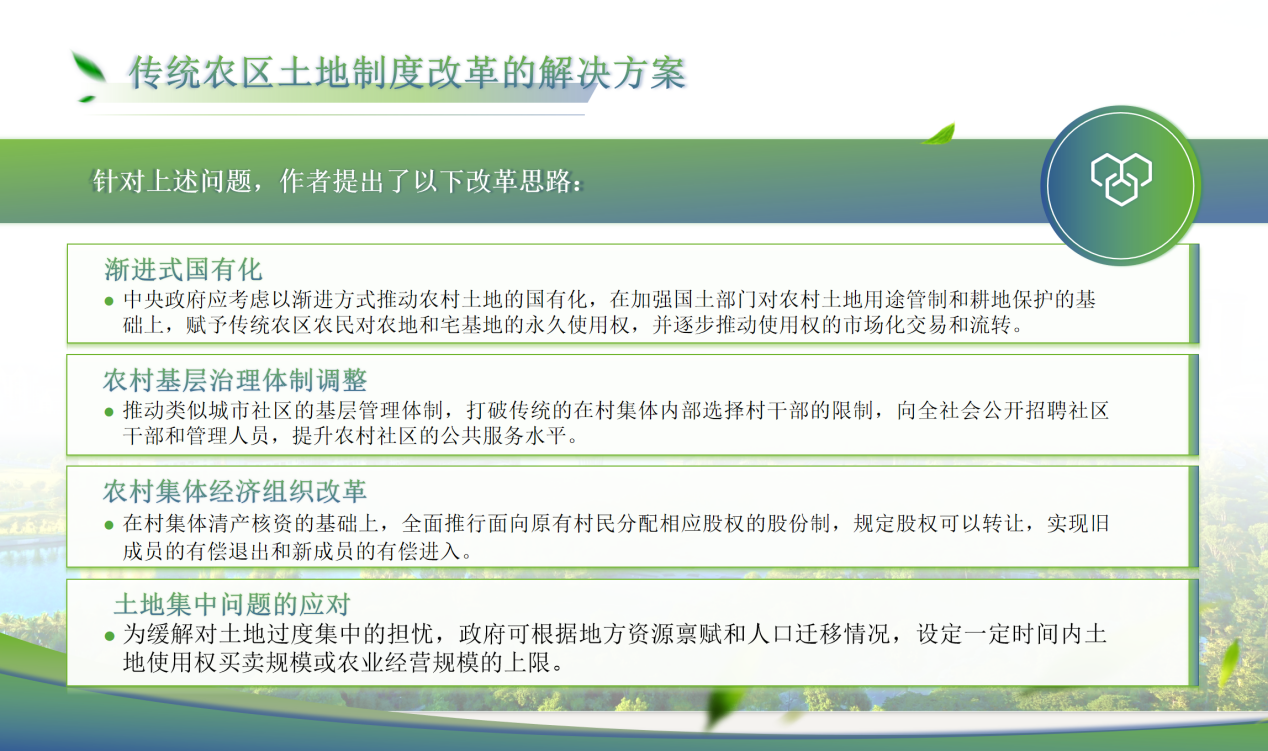 接着,孙睿哲和卢昕玥同学汇报了本书的第六章耕地保护和土地指标交易,主要关注如何完善现有的耕地保护制度,尤其是进一步推动土地指标跨区配置和市场交易的问题。作者首先介绍了中国现有耕地保护制度——农地转用的计划管理和分级审批制度、耕地占补平衡制度和基本农田保护制度,并根据实际情况分析了其积极影响和面临挑战,强调实现耕地保护的关键在于要有有效的制度改革和合理的政策引导。而在耕地保护的实现路径探讨中,土地发展权成为关键。基于此,增减挂钩政策持续推进,通过建新拆旧,实现建设用地总量不增、耕地面积不减,让城乡用地布局更合理。浙江模式脱颖而出,其独特之处为土地资源的合理利用与调配提供了新思路。不过在政策推行过程中,政府垄断、市场活跃度不高的问题逐渐显现,为此,作者提出对全国相关制度进行改进与创新,以优化土地发展权的分配与运用,进一步推动耕地保护工作。
