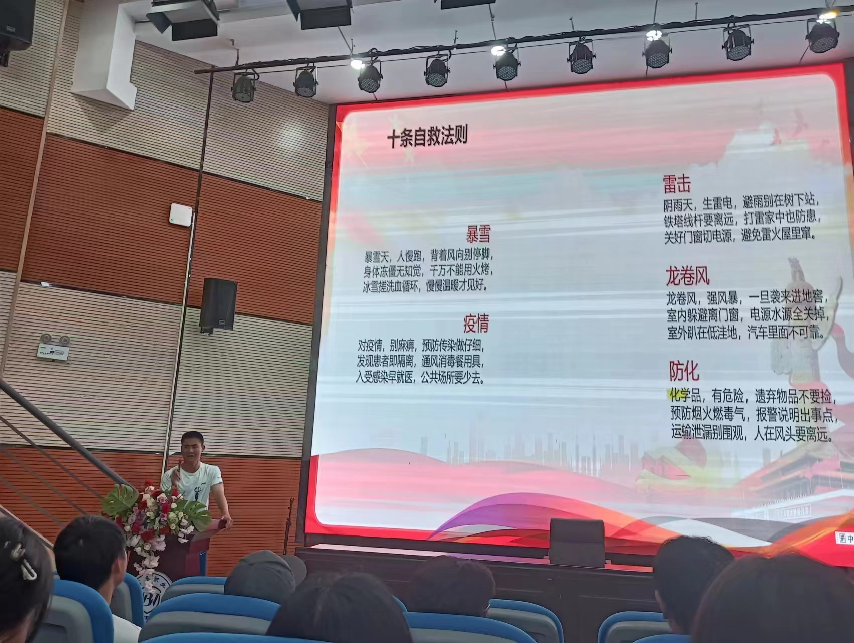 讲座中通过教学视频播放让全体师生观看生活中的实际案例,从暴雪、雷击、疫情、龙卷风、防化、火灾、地震等方面为学生详细阐述自然灾害危害性,同时现场演示紧急避险法、止血法和急救包扎法,希望师生增强自然灾害防范意识,提高实施自救互救和突发事件处置能力,保护自身的生命安全。