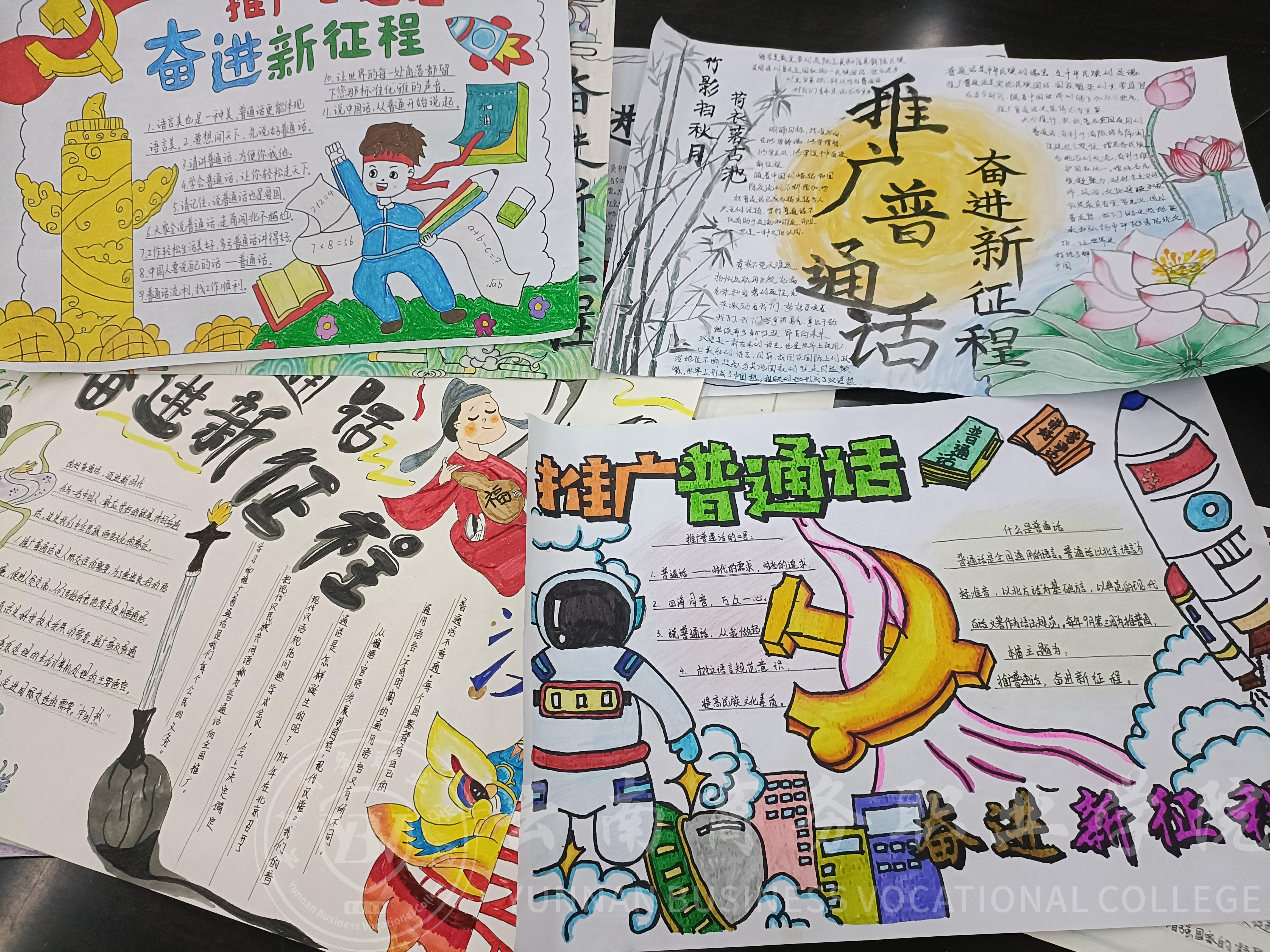 在本届推普周期间,公共基础教学部组织了手抄报征集活动,在文理教研室各位语文老师的积极筹备和宣传下,征集到许多幅作品,为同学们提供一个普通话交流的平台,这次活动不仅提高了学生对普通话的认识和重视程度,还激发了他们对中华优秀传统文化的热爱。