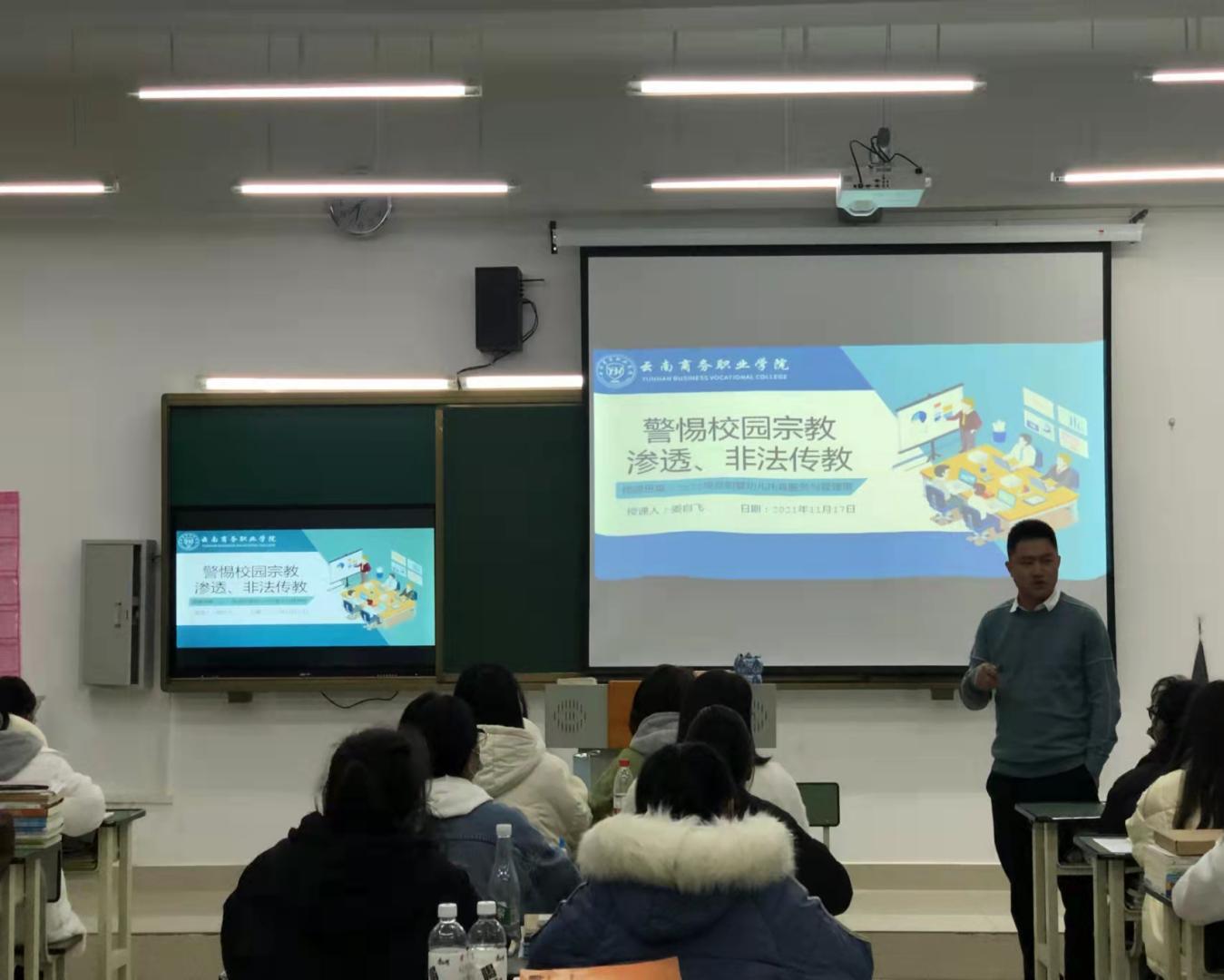 2021年11月17日,统战部部长、副校长娄自飞同志在2栋308教室为学生带来题为“警惕校园宗教渗透、非法传教”的思政课,旨在提高学生识别非法宗教,抵制非法宗教的能力,进一步净化校园文化,构建和谐校园,教育学生树立崇尚科学反对非法宗教的观念,让学生有一个更加美好的学习和生活环境,防范校园传教活动和宗教意识渗透,提高自我思想意识,坚定马克思主义科学信仰。