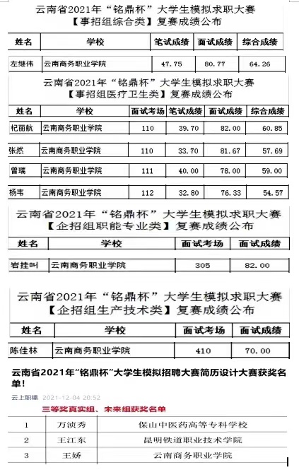 决赛结束后,进行了颁奖典礼,在此次云南省2021年“铭鼎杯”大学生模拟求职大赛省级赛模拟求职赛道中,我校7名参赛选手均获得省级三等奖(铜奖),其中杞丽航是我校本次参赛选手中总评成绩最优异的同学;简历设计赛道中,我校交通旅游学院王娇获得真实组省级三等奖(铜奖),望这部分同学日后再接再厉!