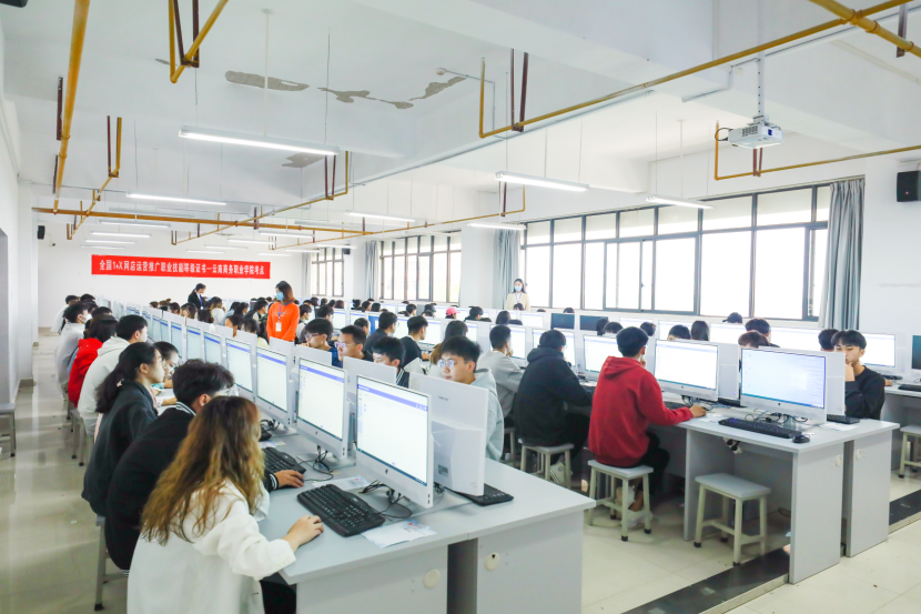 5月21日上午第二场——“1+X”网店运营推广职业技能等级证书(中级)。此场考试组织在电商实训室,共有100名学生参加考试。