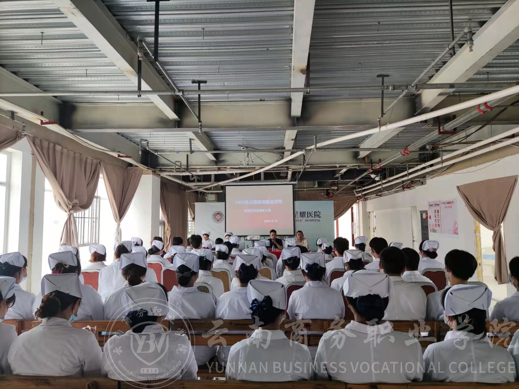 9月19日下午,昆明市第一人民医院-星耀医院护理实习生总结暨优秀实习生表彰大会召开,jinnianhui今年会护理学院石宇超副院长、刘晓妍辅导员代表学院应邀参会。